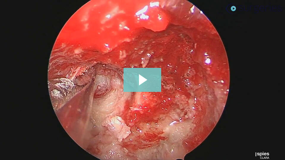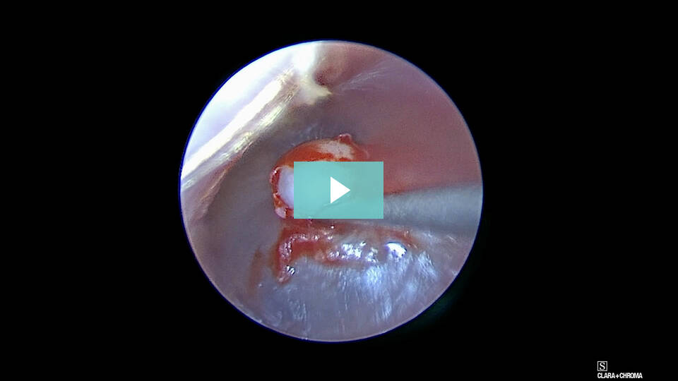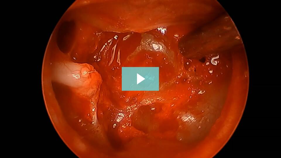 Watch the Full VideoA 3 yo girl was referred to the ENT clinic after her PCP noticed an abnormal TM on the left. She has a history of a 2 ear infections prior to presentation. She is asymptomatic, with no pain and no drainage from her TM. Her audiogram was normal. Her physical eventually revealed the presence of a relatively large keratin pearl on her TM, without obvious middle ear effusions. After a short period of observation the family decided to have it removed. The case was performed endoscopically in a trans-canal approach. The lesion was dissected mainly with a straight pick. The fibrous layer underneath was found to be intact and no myringoplasty was necessary. The patient was was seen again 2 months post-op and her TM was found to be normal with a normal audiogram.
